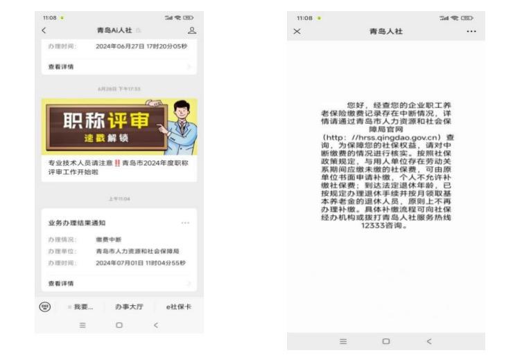 “社保相伴”業(yè)務提醒系統(tǒng)會在參保人登記、停保、漏繳、斷保時,自動將定制化的個人社保信息提醒消息即時發(fā)送至參保人手機端,實現社保信息“被動查詢”向“主動告知”轉變。目前,已上線的提醒服務包括企業(yè)提醒和個人提醒。其中,企業(yè)提醒包括社保政策提醒;個人提醒包括:企業(yè)職工(靈活就業(yè)人員)參保登記提醒、企業(yè)職工(靈活就業(yè)人員)停保提醒、參保人員登記信息變更提醒、停保人員繳費基數及繳費年限提醒、臨近退休參保人中斷繳費提醒、社保轉移業(yè)務辦理進度提醒。