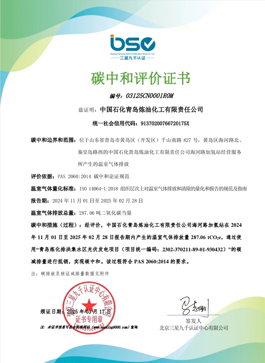 青島煉化公司海河路加氫站于3月17日通過(guò)權(quán)威機(jī)構(gòu)評(píng)價(jià),獲得“碳中和”證書(shū),成為我國(guó)首座“碳中和”加氫站。