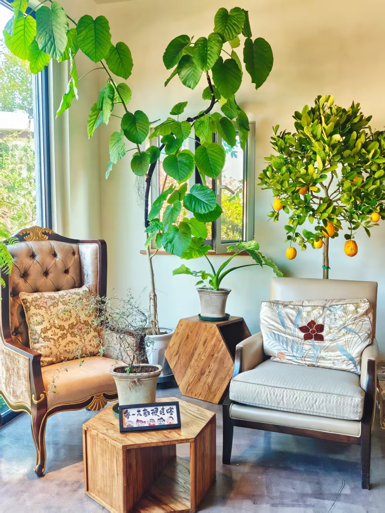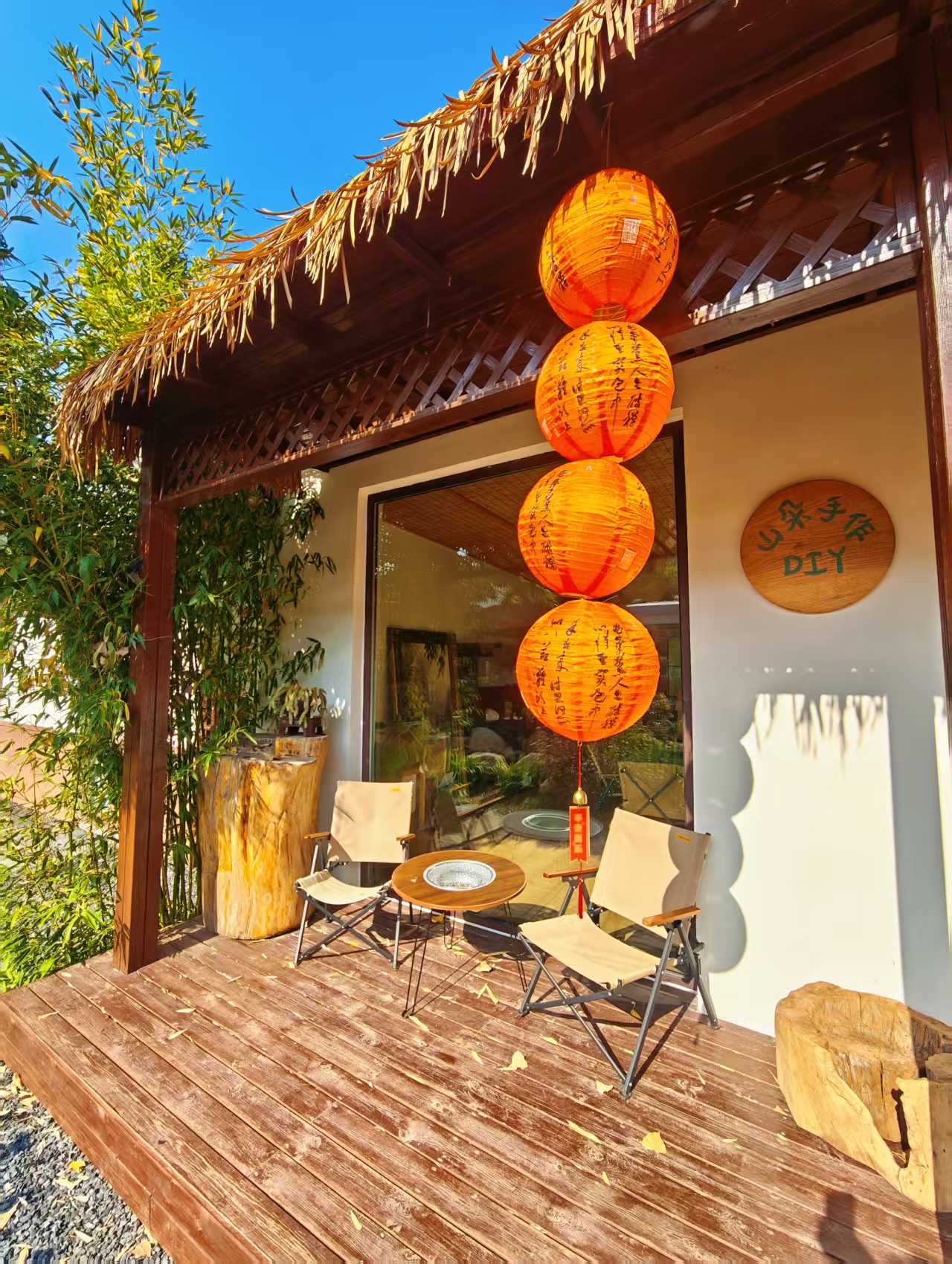 美學(xué)空間:原木風(fēng)桌椅+藤編吊燈,陽光透過玻璃花房灑下,出片率100%。