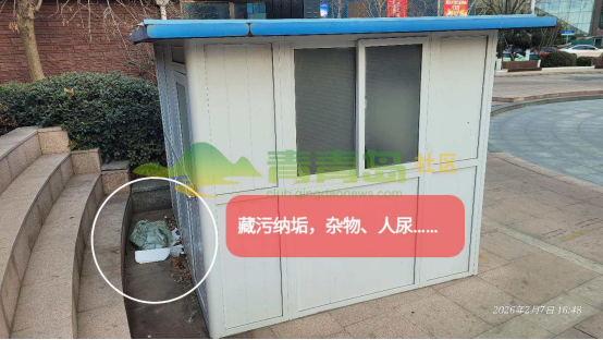 2月8日,有網(wǎng)民在青青島論壇發(fā)帖反映:青島市市南區(qū)延安三路與香港路交叉口處的小廣場(chǎng)上,遺留了1個(gè)小屋,屹立于景觀區(qū)域,存放雜物易燃品,小屋后面藏污納垢,請(qǐng)相關(guān)工作人員盡快清理。