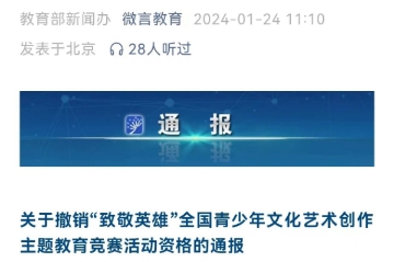 教育部:撤銷“致敬英雄”全國青少年文化藝術(shù)創(chuàng)作主題教育競(jìng)賽活動(dòng)資格