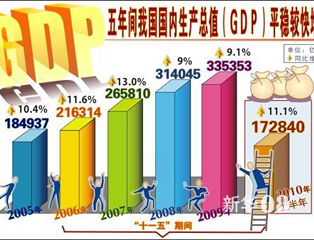 走過5年,中國經(jīng)濟(jì)在世界經(jīng)濟(jì)格局中的地位進(jìn)一步提高。走過“十一五”,在科學(xué)發(fā)展觀的指引下,中國經(jīng)濟(jì)結(jié)構(gòu)調(diào)整不斷深入,在又好又快的道路上不斷前進(jìn)。產(chǎn)業(yè)結(jié)構(gòu)調(diào)整取得積極進(jìn)展。在國民經(jīng)濟(jì)持續(xù)快速增長的5年中,人民生活也得到持續(xù)改善。就業(yè)規(guī)模持續(xù)增長。 |
