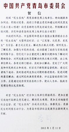 欣聞“民生在線(xiàn)”再度表彰優(yōu)秀上線(xiàn)單位,特向踴躍參加網(wǎng)談,積極對(duì)黨委、政府工作提出意見(jiàn)和建議的網(wǎng)民朋友們表示衷心感謝!向受表彰的與網(wǎng)友坦誠(chéng)交流、積極解決百姓問(wèn)題、共創(chuàng)和諧青島的優(yōu)秀上線(xiàn)單位表示祝賀!