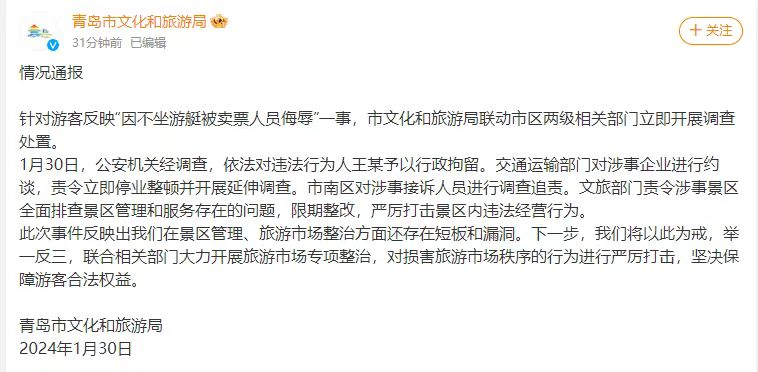 青島市文旅局最新通報:王某行政拘留!涉事企業(yè)停業(yè)整頓!景區(qū)全面排查整改!